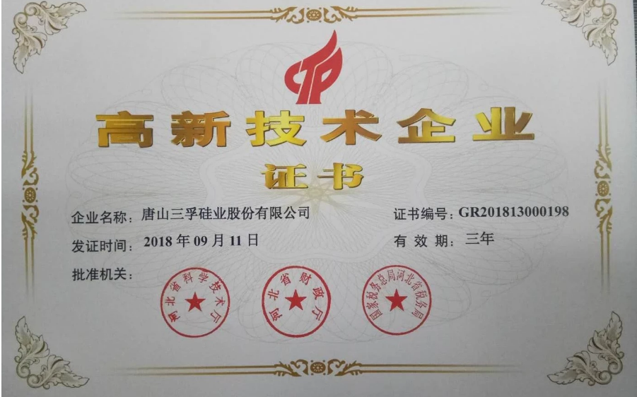 In recent years, the company has taken the opportunity of applying for high-tech enterprises and achieved rapid progress in scientific and technological innovation work, taking the technology research and development platform to a new level. The company won the title of Tangshan New Leading Enterprise, and the "low-carbon Trichlorosilane Product development" won the Tangshan Excellent Project Award for Technological Innovation. Potassium hydroxide is a high-quality product of Hebei Province and a famous brand product of small and medium-sized enterprises in Hebei Province. The company has successively passed the recognition of "specialized, refined, and new small and medium-sized enterprises" and "technology giant" in Hebei Province. The R&D organization of the company has passed the accreditation of "A level industrial enterprise R&D organization above designated size in Hebei Province" and "Tangshan Enterprise Technology Center", and the "Tangshan Chlorosilane new material engineering technology research center" undertaken by the company has been included in the key training plan of Tangshan science and technology R&D platform construction. Four projects including "95% potassium hydroxide Product development" were included in the provincial and municipal new product and new technology development plans. Two projects, including "High purity Silicon tetrachloride purification phase II (20000 tons/year) reconstruction and expansion project", were included in the provincial key technical transformation plan. As of now, the company has 18 authorized patents, including 1 invention.