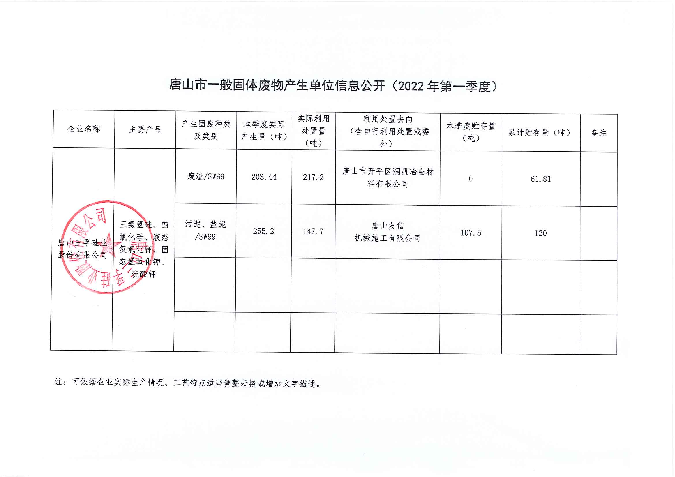 唐山三孚硅業(yè)股份有限公司2022年一季度一般固體廢物廢物信息公開
