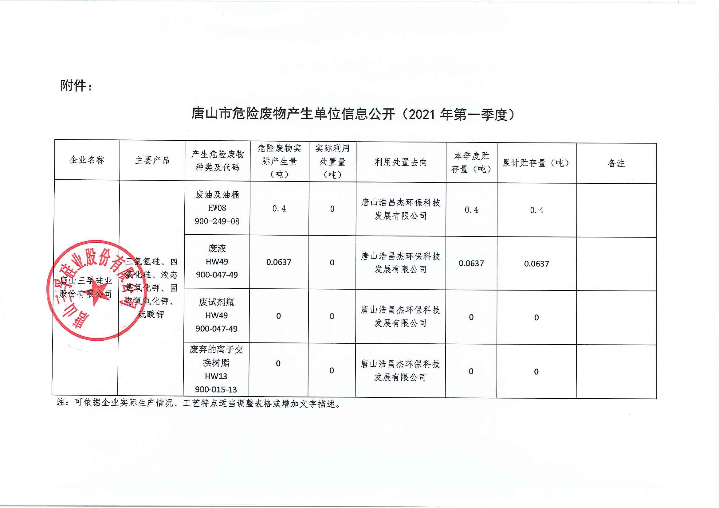 唐山三孚硅業股份有限公司2021年1季度 危險廢物產生單位信息公開