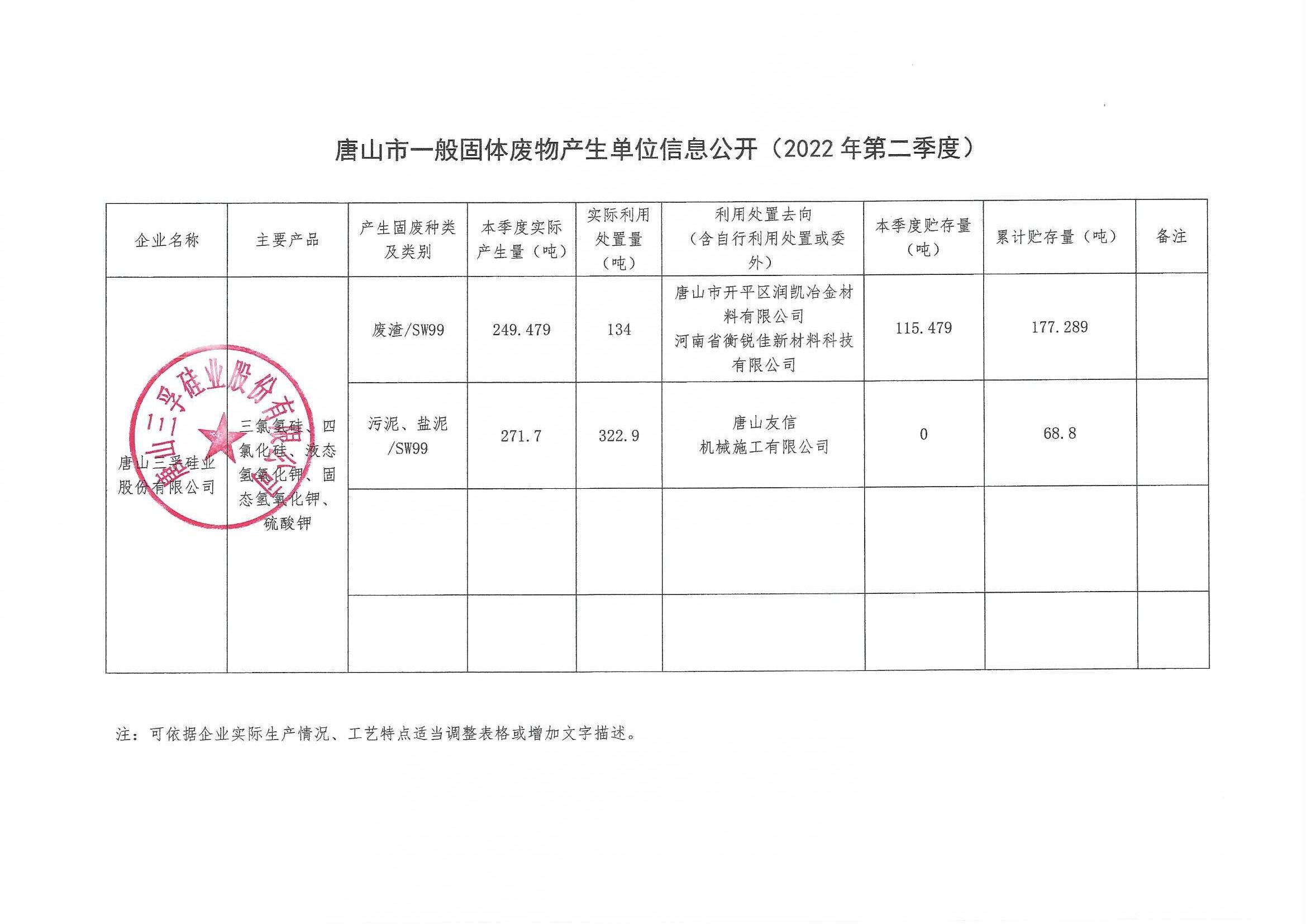 唐山三孚硅業股份有限公司2022年二季度一般固體廢物廢物信息公開