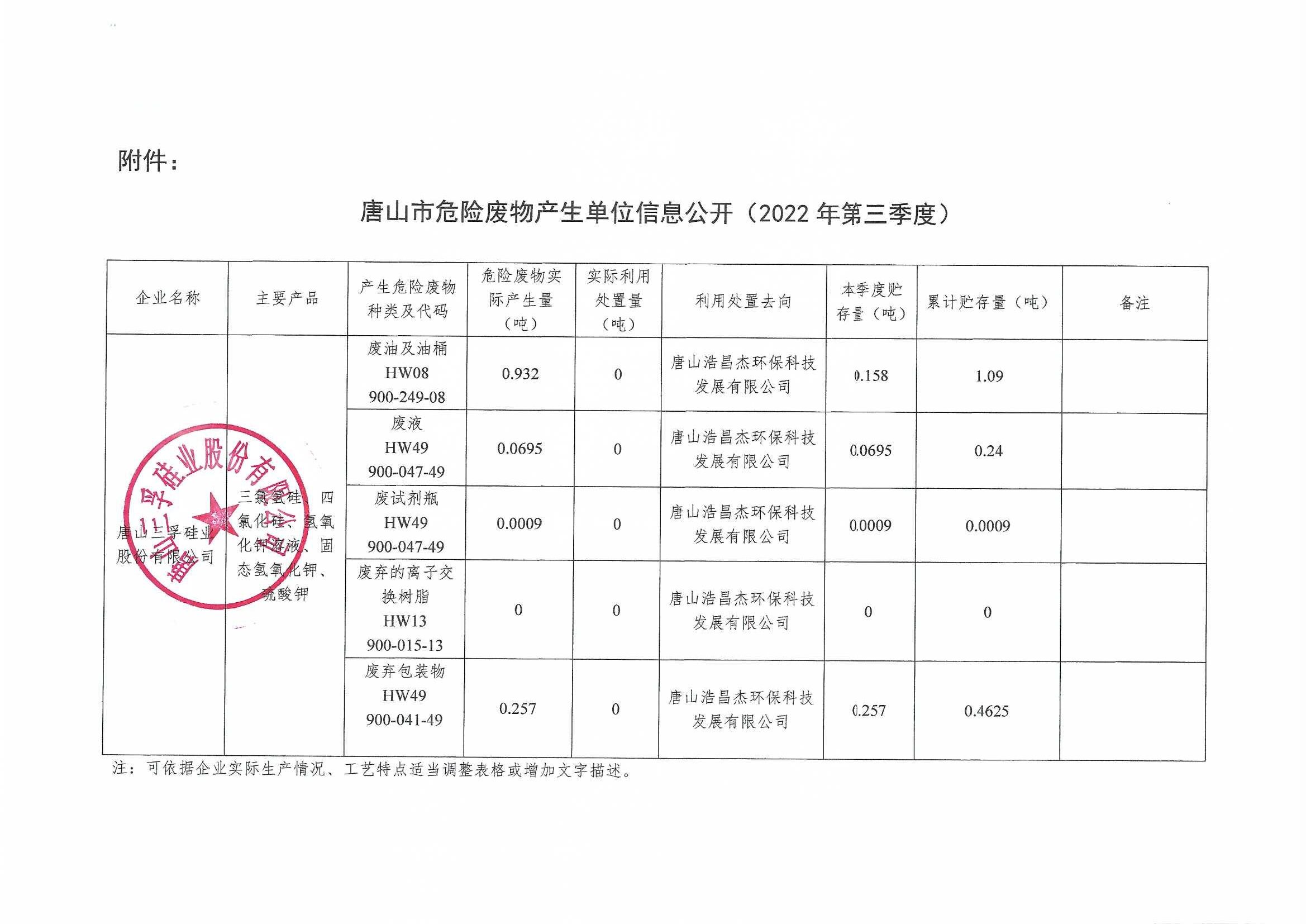 唐山三孚硅業(yè)股份有限公司2022年第三季度危險廢物信息公開