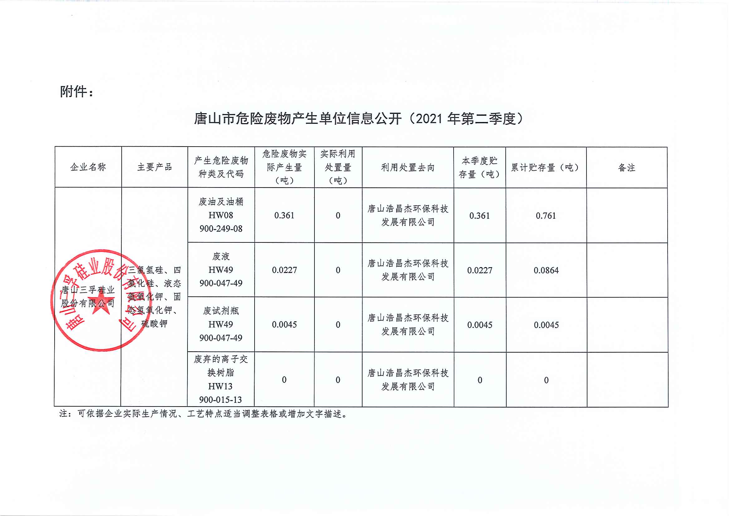 唐山三孚硅業(yè)股份有限公司 危險(xiǎn)廢物 二季度信息公開